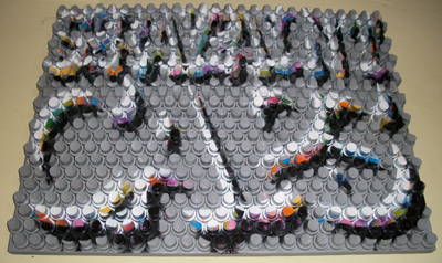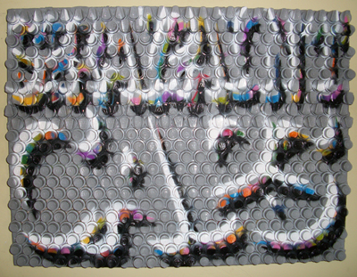 Medium: Stencil/Spraypaint on used spray caps mounted to wood