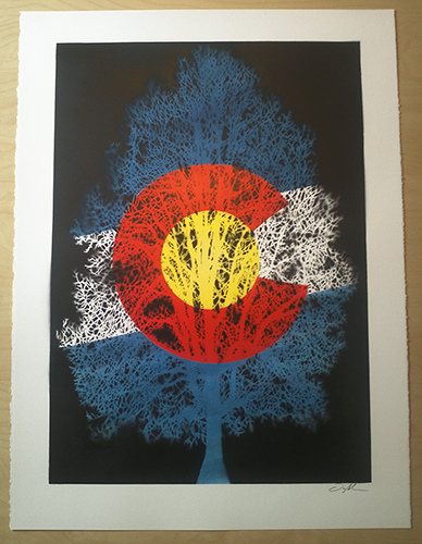 Note: hand cut stencils and spraypaint. Each of the prints in the edition is slightly unique due to the process. Signed, numbered and embossed.