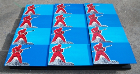 Medium: Stencil and Spraypaint on Matboard mounted to wood.