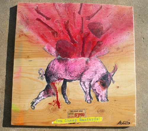 Medium: Gel Transfer, Spraypaint, and handcut stencil on 1" plywood