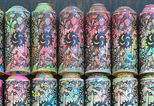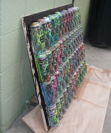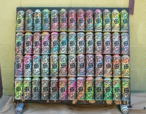 Medium: 52 old spray cans mounted to a drip stained piece of 1" agathis wood. Each can was sprayed and then a gel transfer was added.