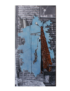 Medium: Giclee wheatpasted base with Stencil/Spraypaint on wood box