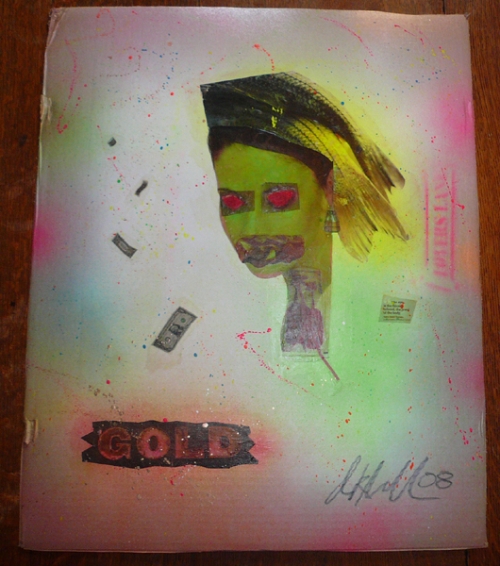 Medium: Gel Transfer, Spraypaint, and handcut stencil on cardboard