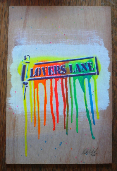 Medium: Handcut Stencil, spraypaint, acrylic, and glitter on wood