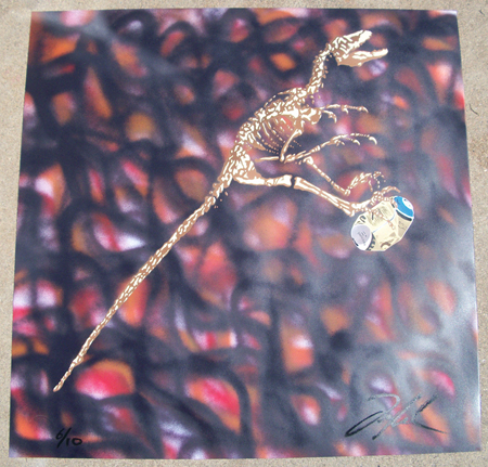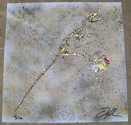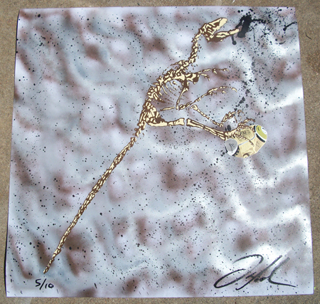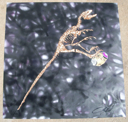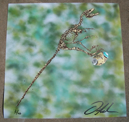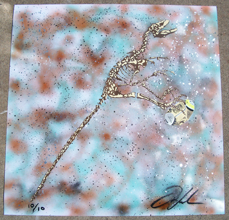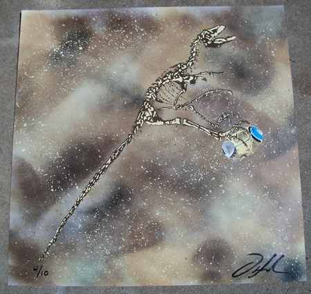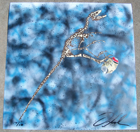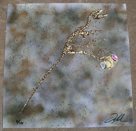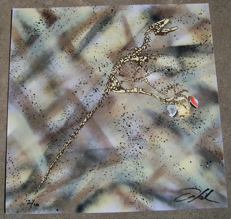 Note: 8 hand cut stencils and spraypaint. Each print has a unique background. Prints come signed, numbered and embossed.