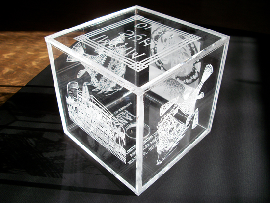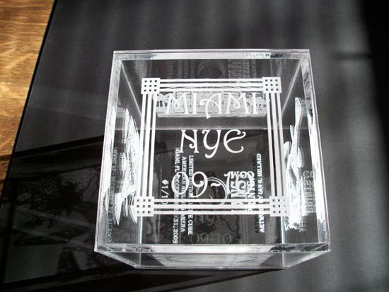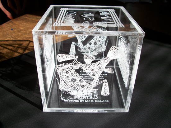 Each of the 6 sides of lucite are laser etched with artwork by Ian Millard. The bottom has a color changing LED light that works on replaceable batteries. Each of the cubes are numbered out of ten and will come in a box designed by Ian.