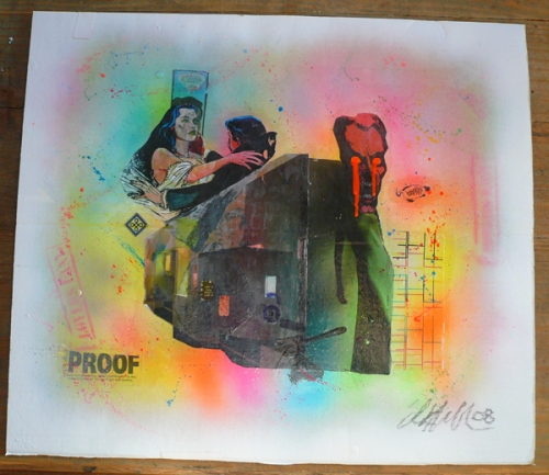 Medium: Gel Transfer, Spraypaint, and handcut stencil on cardboard