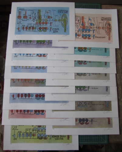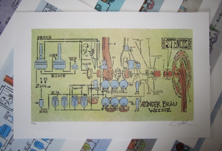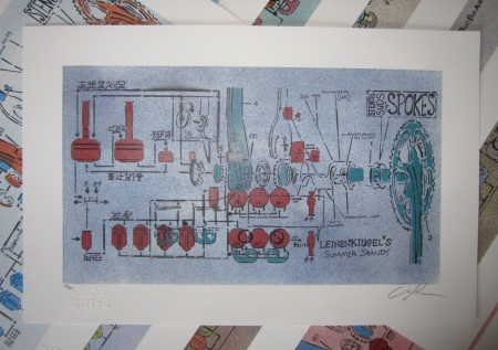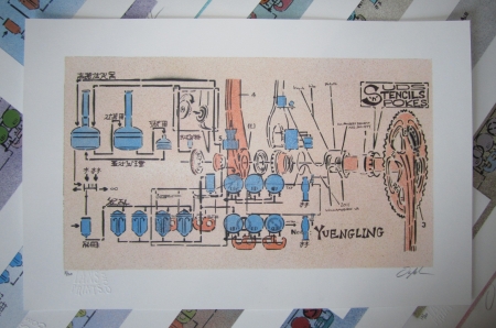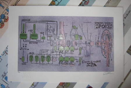 Note: Stencils, Suds & Spokes was created using 4 hand cut stencils, spraypaint and sharpie marker. Each print in the edition is a unique color scheme with hand finishing. Prints come signed, numbered and embossed. 15 of the 20 prints were donated to the "Screens 'n' Suds 'n' Spokes" event being held in Williamsburg, VA on June 6th. All proceeds from the print sales will benefit MS Society.