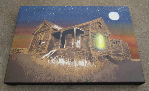 Note: Created using 8 hand cut stencils and spraypaint. The canvas will be on display at Gallery 1988 in Los Angeles, CA from December 2 - December 24, 2011. More information on the art show is here.