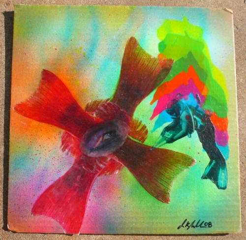 Medium: Gel Transfer, Spraypaint, and handcut stencil on cardboard