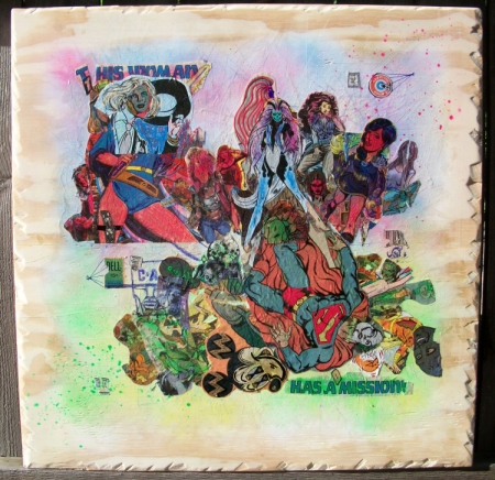 Medium: Gel Transfered comic collage over stencil, spray, paint marker, pencil and pen background on wood