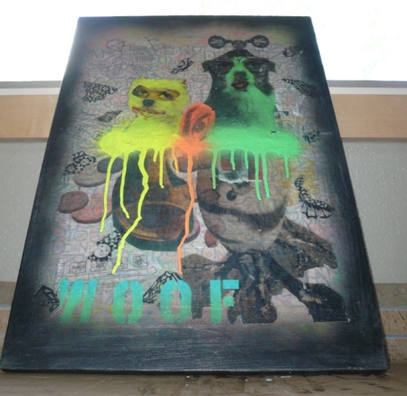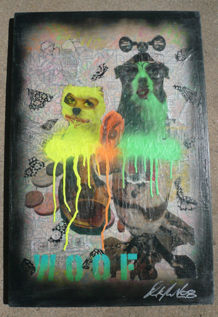 Medium: Linocut, Gel Transfer, Spraypaint, and stencils on 1" birch wood